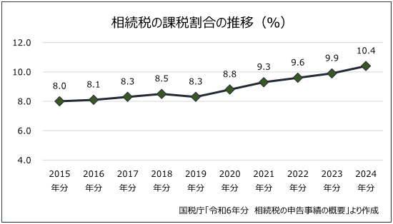 2014年分は4.4%だった相続税の課税割合は、2015年分に8.0%に、2021年分では9.3%となり、2024年分には10%を超えて10.4%となりました。