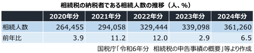 相続税の納税者である相続人は2020年分以降、増加を続けています。特に2021年分と2022年分は10%以上増加し、2022年分では30万人を超えました。その後も増加を続け、2024年分は前年比6.5%増の約36万人となりました。
